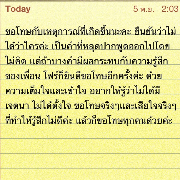"วันนี้แอปเปิ้ลกำลังจะเข้าไปดูละครเวที JUMP ที่เซ็นทรัลเวิลด์ เผอิญเจอนักร้องคนนึงเดินถือดอกไม้เข้างานมาคนเดียว จากนั้นเราก็เข้างานด้วยกันพร้อม ๆ กับคนอื่น แต่คนอื่น ๆ ไม่ได้มีดอกไม้ติดมือมาด้วยเลย แล้วจู่ ๆ นักร้องคนนั้นก็พูดขึ้นมาเสียงดังว่า "สรุปให้ชั้นซื้อดอกไม้มาคนเดียวหรอ ลาวมาก!" (ด้วยสีหน้าแย่ ๆ) แอปเปิ้ลเลยหันไปด้วยความโมโห แล้วถามกลับไปว่า "ลาวแล้วทำไม..?!" นักร้องคนนั้นก็พูดขอโทษ ๆ แล้วขำกลบเกลื่อน จบ. หลังจากนั้นแอปเปิ้ลเลยไม่ดู แล้วเดินออกมาเลย โกรธมากถึงมากที่สุด เพราะนี่ไม่ใช่ครั้งแรกที่นักร้องคนนี้ใช้คำว่าลาวในการดูถูกคนอื่น คนลาวก็เป็นคนเหมือนกัน และแอปเปิ้ลก็เป็นคนลาวคนนึง ฝากถึงนักร้องที่แอปเปิ้ลพูดถึงด้วย คุณโฟร์ ศกลรัตน์ พูดแล้วขอโทษมันไม่หายหรอกนะ ทางที่ดีเลิกใช้คำว่าลาวดูถูกคนอื่นเถอะ"